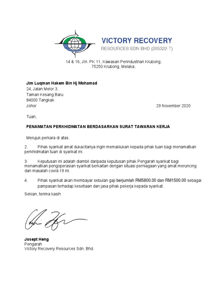 Penamatan perkhidmatan berdasarkan surat tawaran kerja. Kandungan dan susunan kata. Rayani air arah berhenti kerja batal surat tamat khidmat semasa mstar.